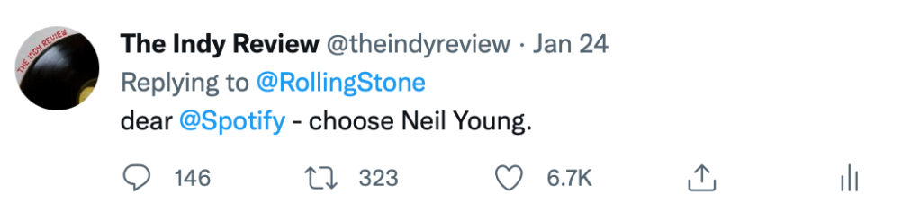 Unfortunately last week, I stupidly dipped my toe into the culture war, and was soon drowning in it. For those of you not aware, famed folk rocker Neil Young gave music streaming giant Spotify an ultimatum: remove all of his music from the service, unless they stop podcaster Joe Rogan‘s spreading of covid misinformation. Obviously, as a fan of classic rock, who has many of Neil’s classic songs across my playlists, I didn’t want to lose access to that vast catalogue, so I made a small reply to one Rolling Stone article post on Twitter: