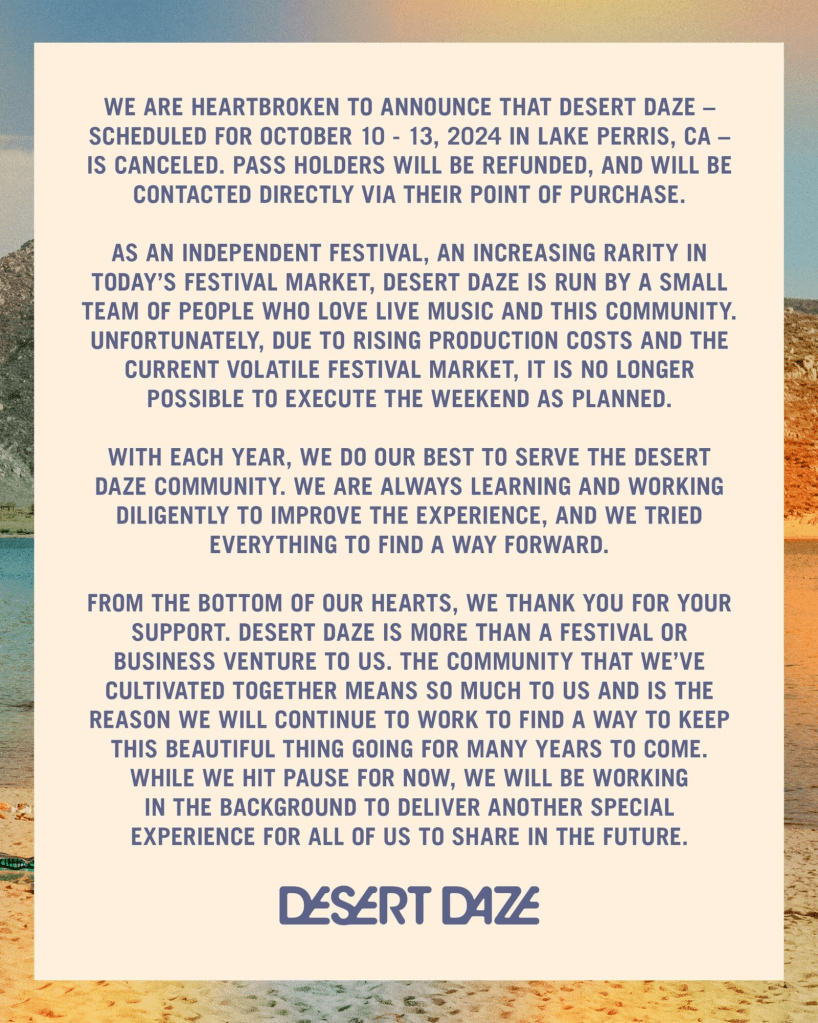 The folks from Desert Daze posted an announcement that their festival slated for October 10-13, would be canceled. In their post, they discuss the pressure of operating as an independent festival, the rising costs of productions, and the volatile market of festival attendees.
