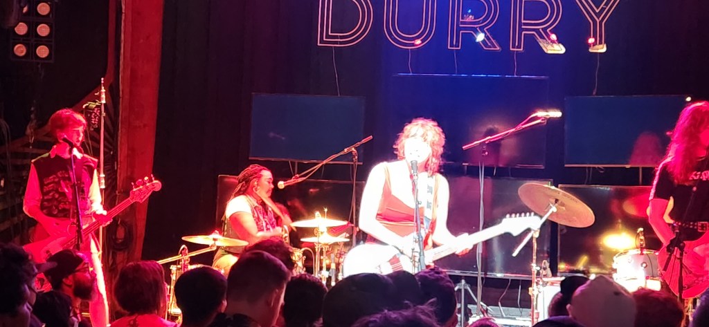 It makes sense that a Gen Z band, born from a culture obsessed with screens, would figure out unique and fun ways to incorporate screens into their live performance. And Durry feel like the quintessential Gen Z band. Formed by brother/sister duo Austin and Taryn, the band broke big thanks to their song “Who’s Laughing Now” blowing up on TikTok, and they’ve since made many fun, inspired music videos that play into pop culture and what’s in the zeitgeist. From Austin’s brave mullet-like haircut to Taryn wearing pajama pants onstage, they have captured the aesthetic of their age in a fully organic way. And seeing them live at the Troubadour last Monday night, they backed up catch, relatable songs with a creative, innovative stage show that actually felt like something new and completely unique to them.