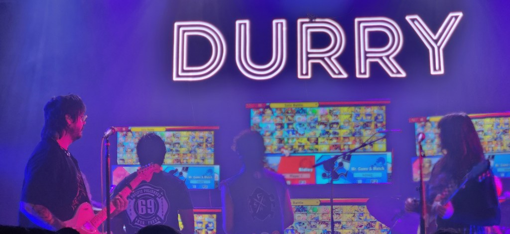 Up until that point, the use of screens had been fun and lively, but not anything I hadn’t seen before from bigger bands with bigger screens. Then Durry made it their own, bringing Super Smash Bros onto the screens, and bringing up two pre-selected players to battle each other. Durry split the room into two sides, one rooting for Ganandorf, and the other (where I was) cheering on Mr. Game & Watch. As the match began, Durry went into their next song, which was perfectly timed to coincide with the match timer. The crowd booed and cheered as the two fighters proceeded to smash each other and knock each other offscreen (sadly my guy lost).