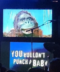 Six screens were erected on the stage after Gully Boys left, along with a light-up “Durry” sign hanging high. One by one, the screens turned on, showing clips from the original King Kong vs. Godzilla, along with other videos on loop. The kitsch of it all made me smile, helping to create the lighter mood for Durry‘s entrance. The band went right into a couple of their heavy-ish tracks, “Bully” and the topical “Monopoly Money.” Even when going a little harder, Durry‘s music is still consistently catchy, with smart lyrics and hooks that make them easy to sing-along to. And as they played these songs, appropriate visuals and lyrics came up on the screens behind them, elevating the performance.