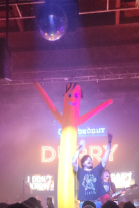 The personal and political continued to mesh, as Durry played caustic songs like “Worse for Wear” and “I’m Fine (Really)”. Things became more fun again for “idk I just Work here”, with one of those large, inflatable guys with their arms in the air that you normally see at car dealerships popping out at the front of the stage. And just as quickly, the band shifted the vibe, revealing the moving story behind their song “The Long Goodbye” before playing that acoustically. The lyrics of the song, touching on mortality and savoring life, really hit home hearing them live.